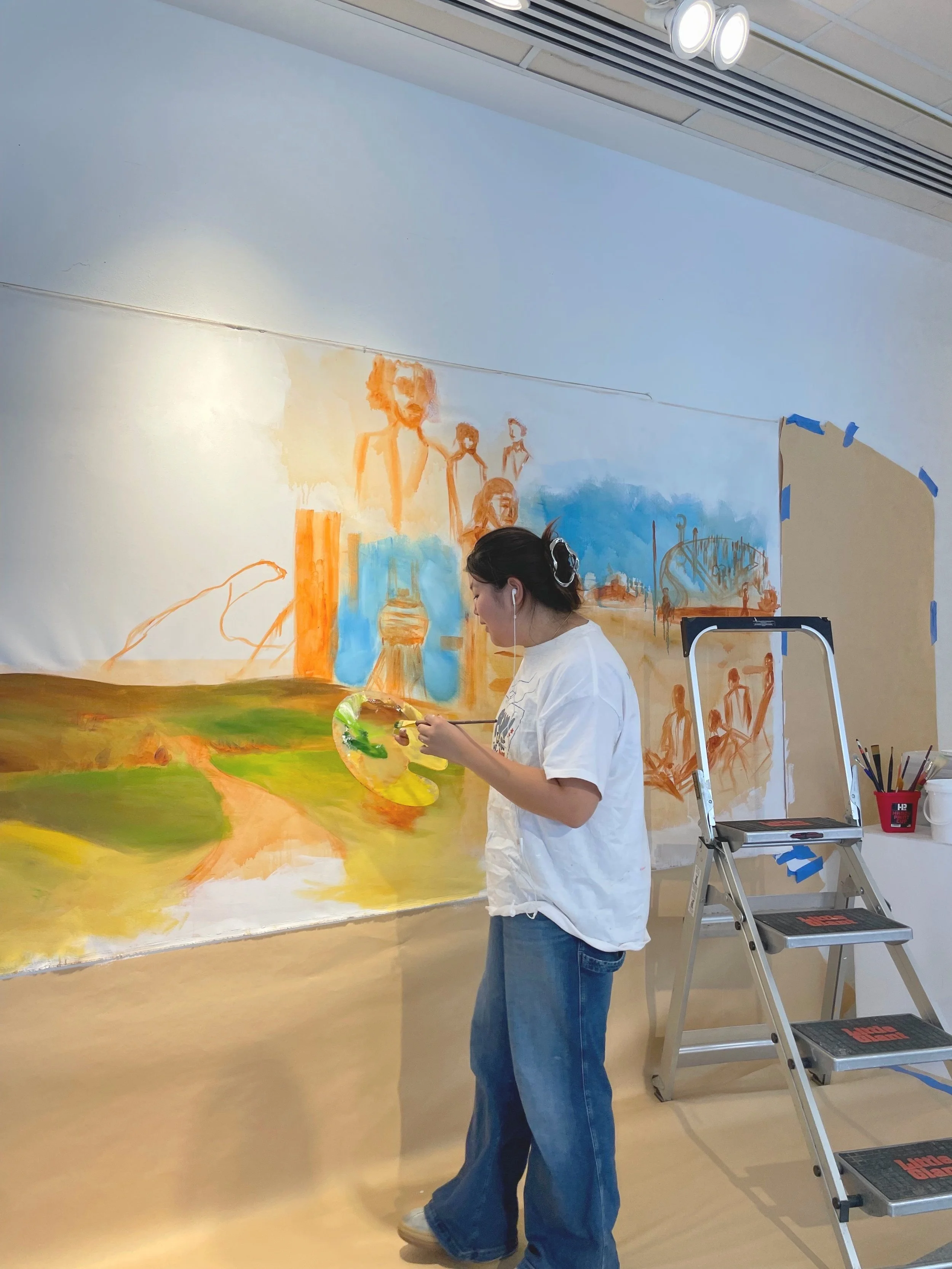 Michelle Wen is an artist, designer, and student currently living in Philadelphia, PA. She will graduate from the University of Pennsylvania in May 2025 with a BA in Fine Arts. Her work, largely centered around a painting practice with elements of mixed media deisgn and colalge, is often concerned with her Chinese-American identity. Having split her childhood across New York City and Shanghai, China, she is interested in exploring the boundaries and contrasts between vastly different cultural landscapes. Through the depictions of physical spaces, cultural symbols, and arvhical materials, different perceived worlds are forced into conversation with one another. Her most recent project, First Week in America, September 1991 (2025), focuses on the specificity of the immigrant experience, and the role of both natural and man-made landscapes within the development of a cultural narrative.